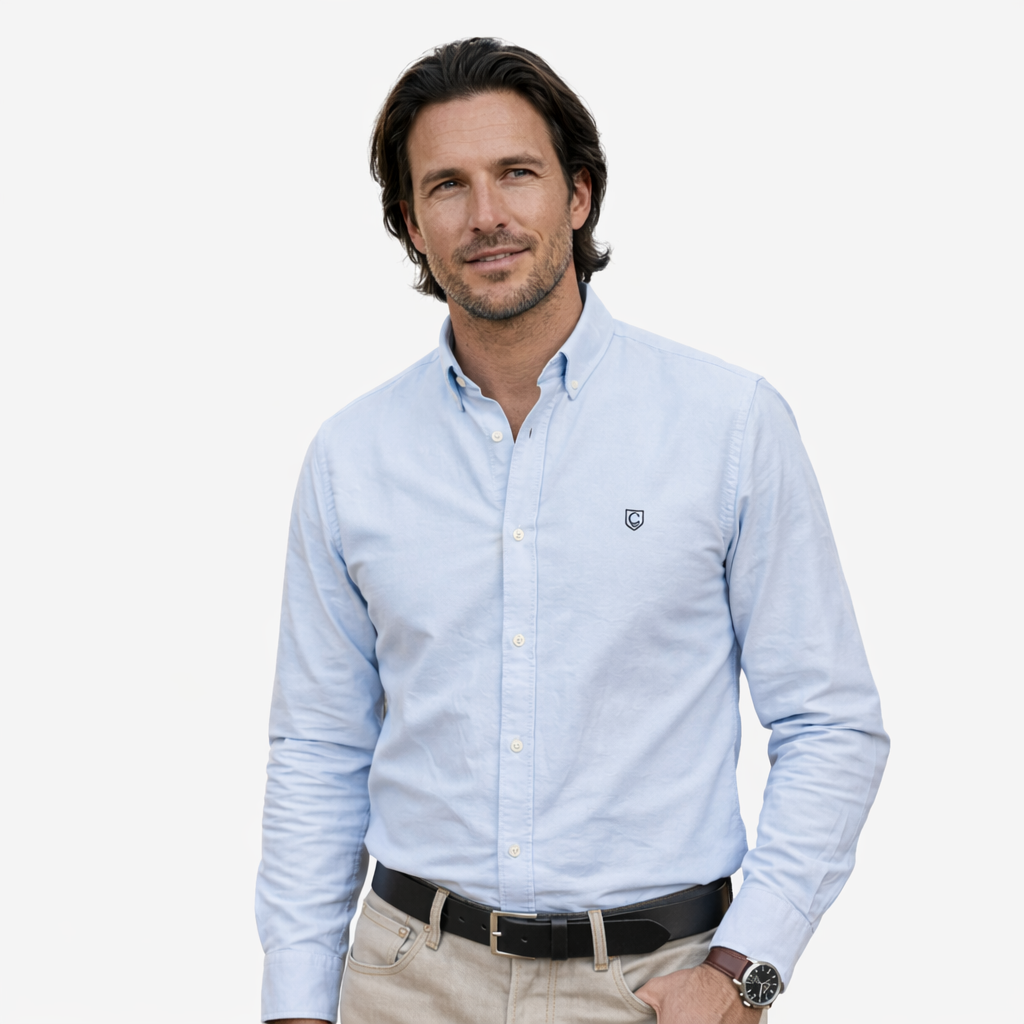 Esta camisa azul celeste 100% algodón, hecha en España, está pensada para convertirse en una de las prendas más versátiles del armario. Tiene un color suave, muy favorecedor, que ilumina la cara y combina prácticamente con cualquier pantalón. El isotipo de Cayetanos va bordado en azul marino en el pecho, aportando un detalle elegante y discreto, sin grandes logos ni estridencias.