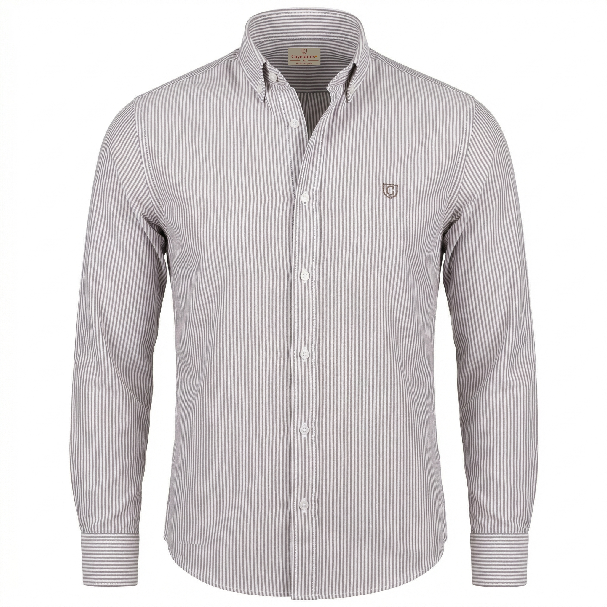 Esta camisa de rayas color tostado, 100% algodón y hecha en España, está diseñada para aportar un toque cálido y sofisticado al look. Las rayas en tono tostado sobre el fondo claro estilizan y favorecen, y el isotipo de Cayetanos va bordado en el mismo tono tostado en el pecho, creando un conjunto muy equilibrado y discreto.