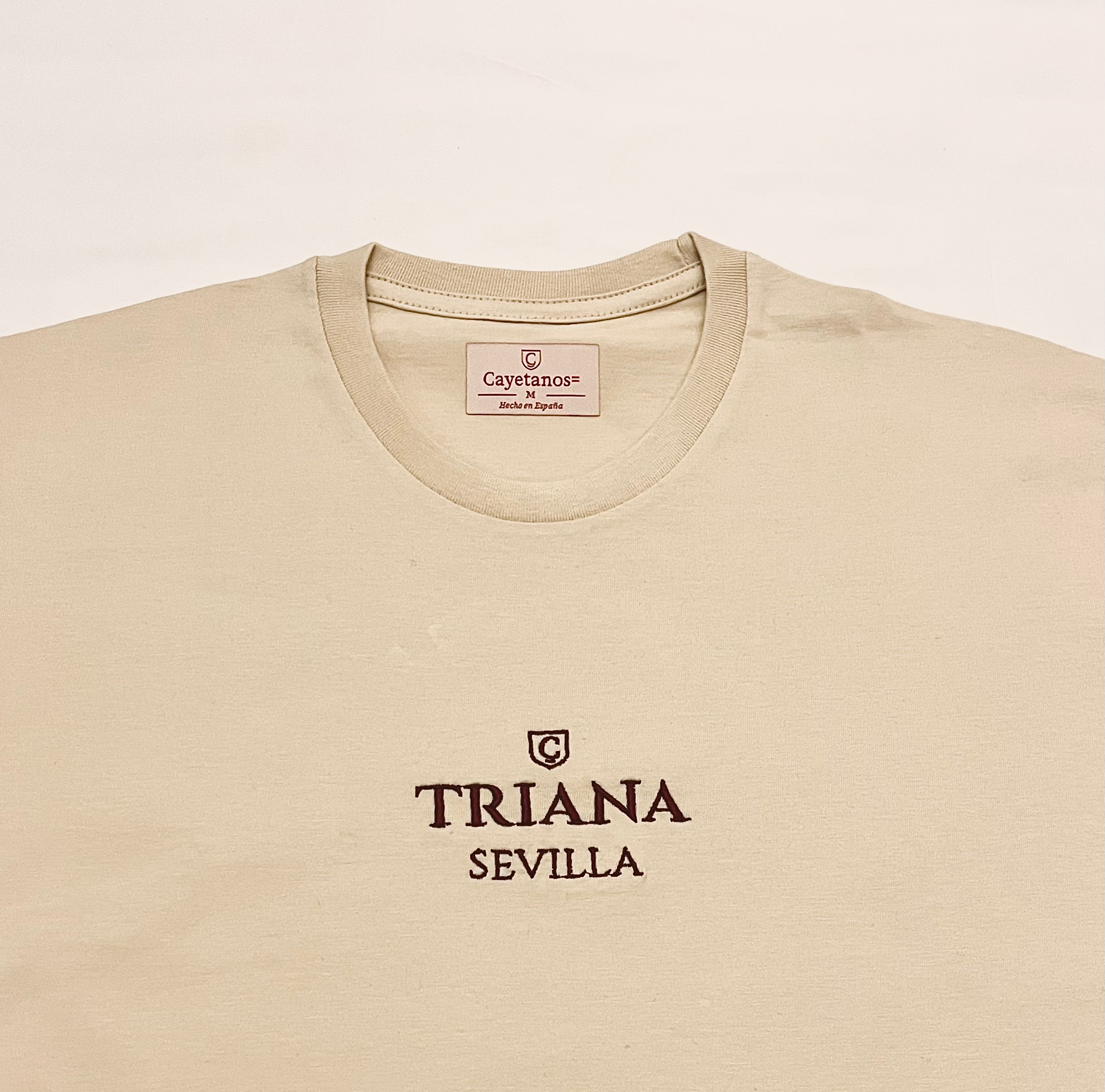 Esta camiseta, fabricada en España con tejido 100% algodón, tiene un tono crema/blanco roto muy favorecedor y fácil de combinar. En el centro del pecho lleva el isotipo de Cayetanos sobre la palabra “TRIANA” y, debajo, “SEVILLA”, todo bordado en color granate. El bordado le da relieve, presencia y un aspecto mucho más elegante y duradero que una simple impresión.