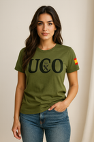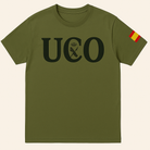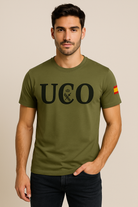 Camiseta verde militar 100% algodón premium, inspirada en la Unidad Central Operativa (UCO) de la Guardia Civil. Un diseño sobrio y elegante con las siglas UCO en el pecho y la bandera de España en la manga, que aporta un estilo y personalidad únicos.