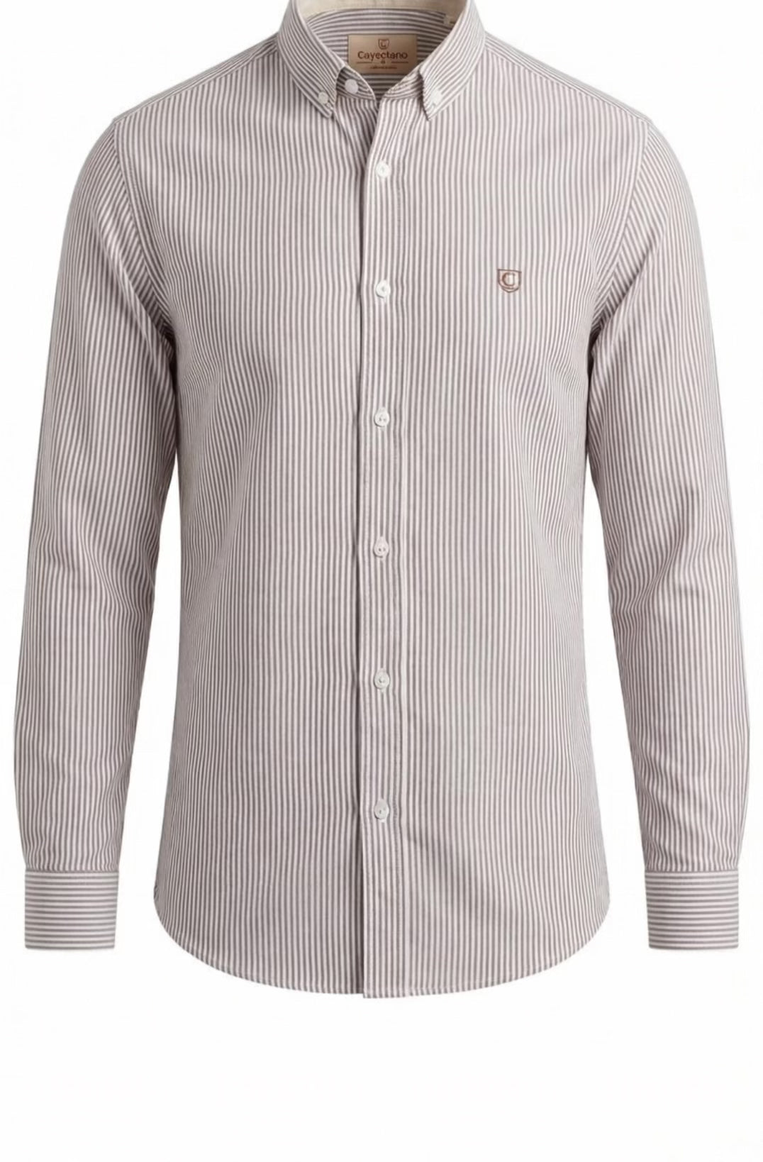 Esta camisa de rayas color tostado, 100% algodón y hecha en España, está diseñada para aportar un toque cálido y sofisticado al look. Las rayas en tono tostado sobre el fondo claro estilizan y favorecen, y el isotipo de Cayetanos va bordado en el mismo tono tostado en el pecho, creando un conjunto muy equilibrado y discreto.