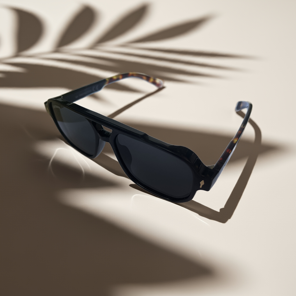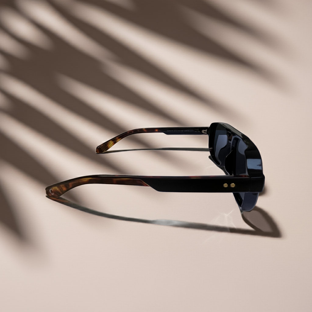 Las Gafas de Sol Cayetanos – Modelo Málaga son pura personalidad del sur. Con una montura de policarbonato negro brillante y detalles metálicos dorados que atrapan la luz como un atardecer en La Malagueta, este diseño une fuerza y elegancia en una estética inconfundible.