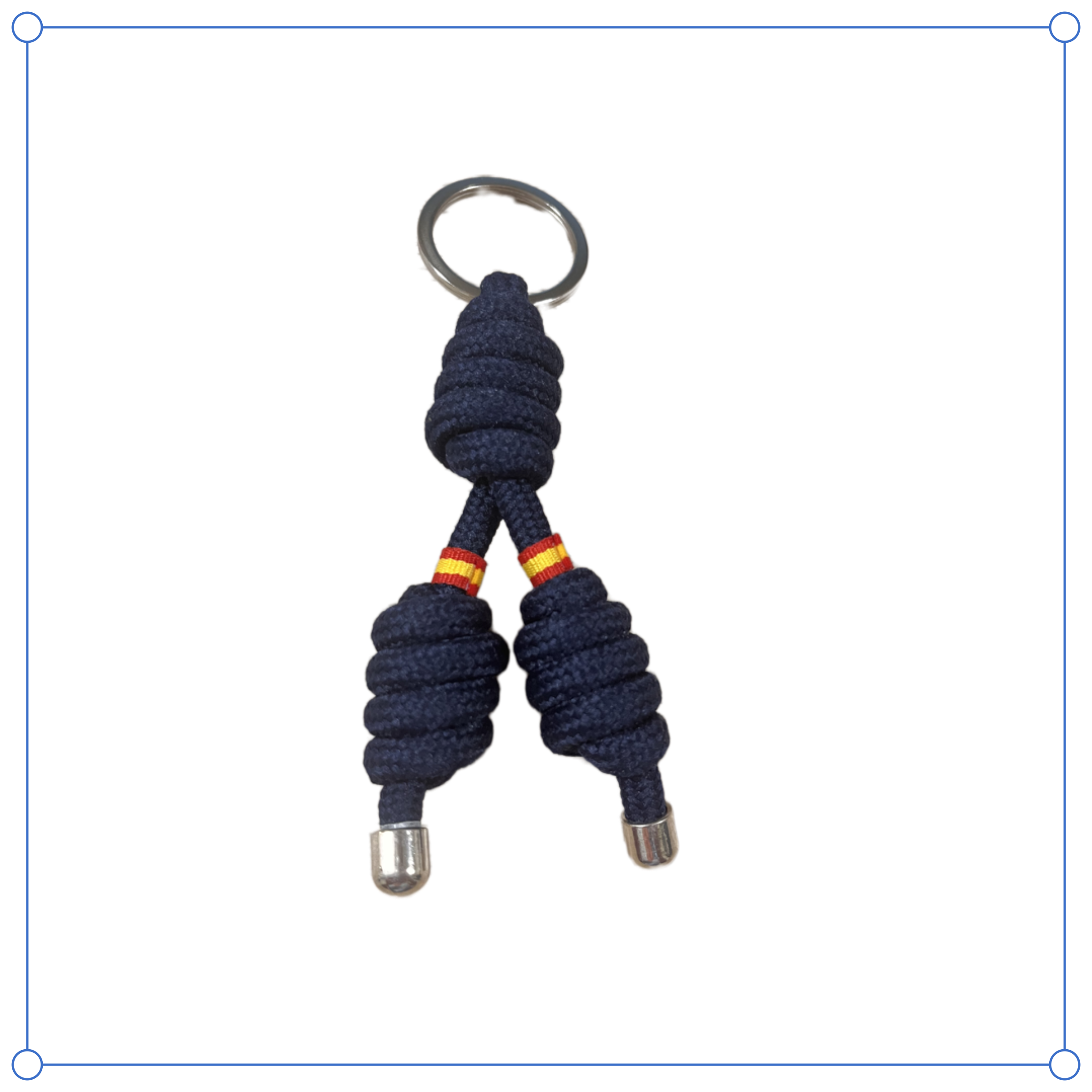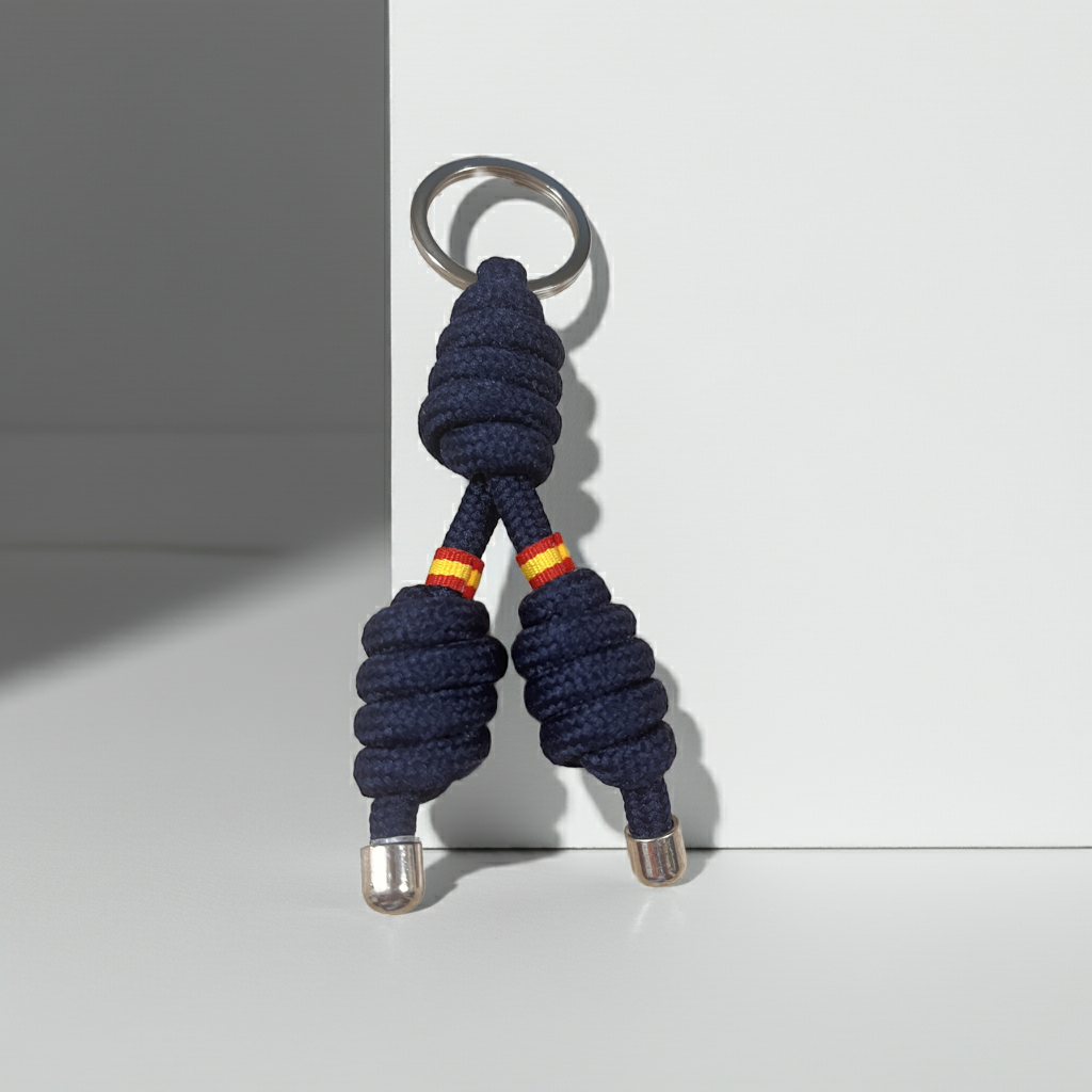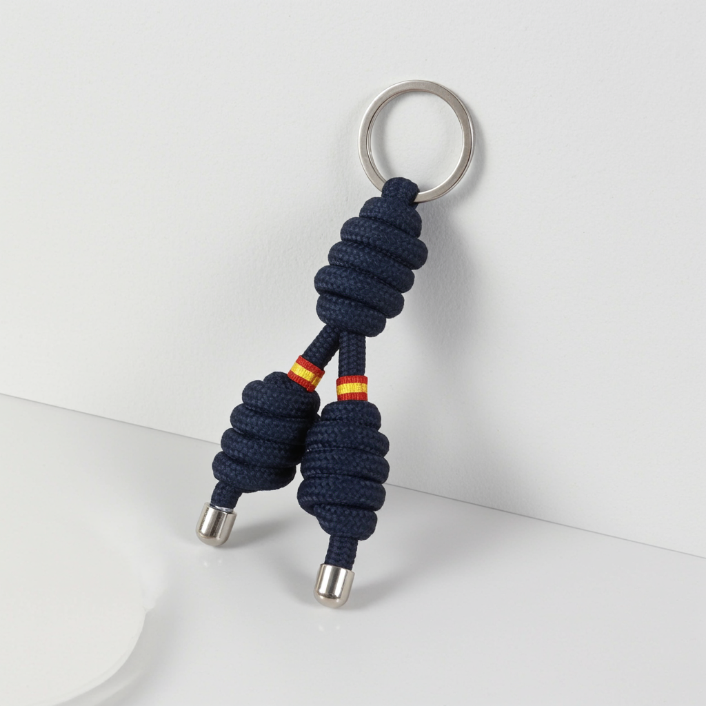 El llavero azul marino con bandera de España destaca por su diseño original de nudos decorativos y su resistencia. Fabricado en cuerda trenzada de alta calidad, incorpora detalles metálicos en los extremos y una anilla superior pulida que garantizan durabilidad y estilo.