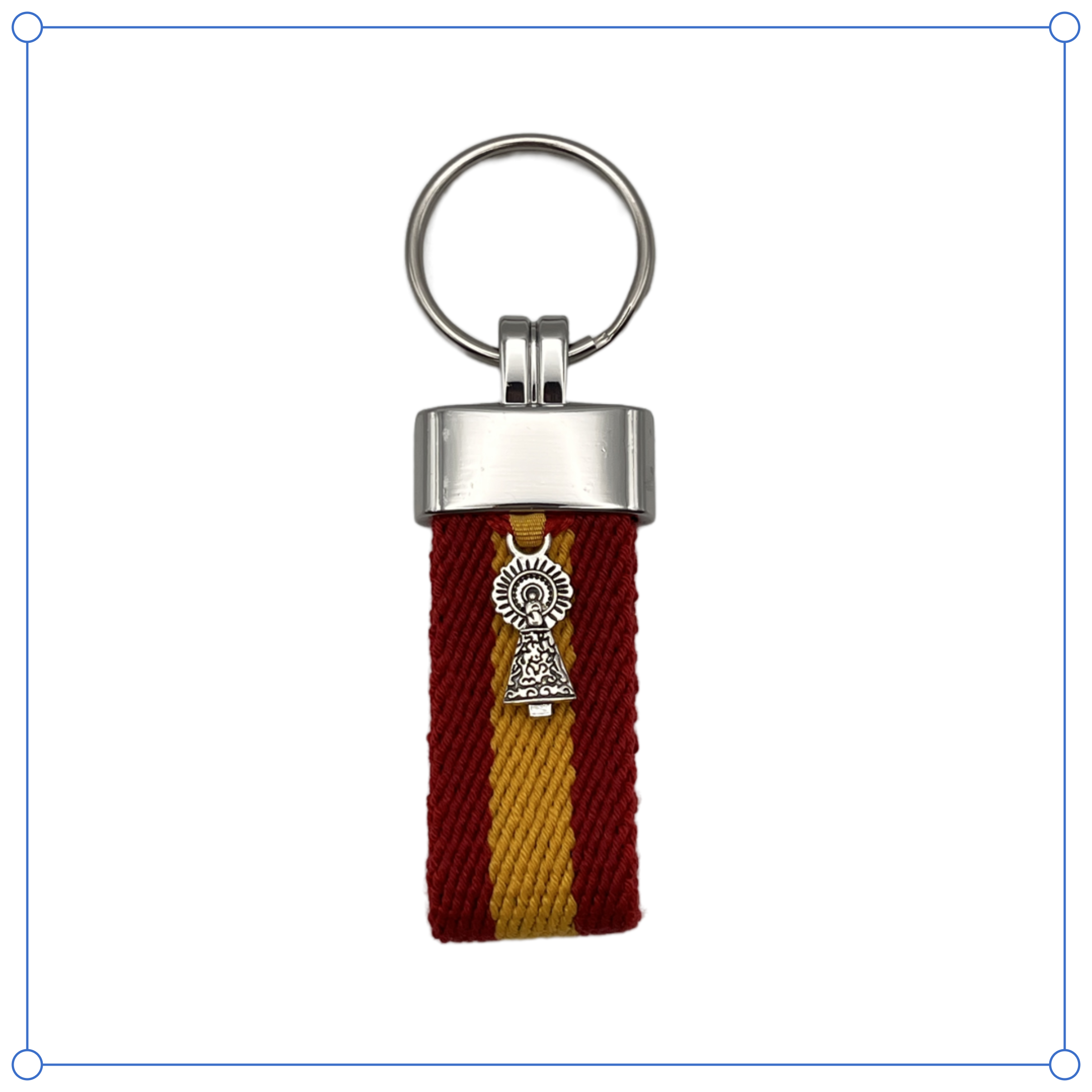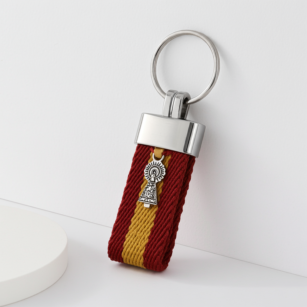 Confeccionado en cinta textil de alta calidad con los colores de la bandera española, incorpora una pieza metálica superior pulida y un colgante de la Virgen del Pilar en acabado plateado. Su anilla metálica resistente asegura practicidad y durabilidad en el día a día.