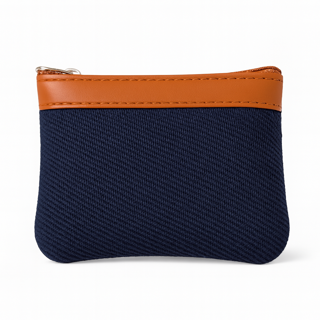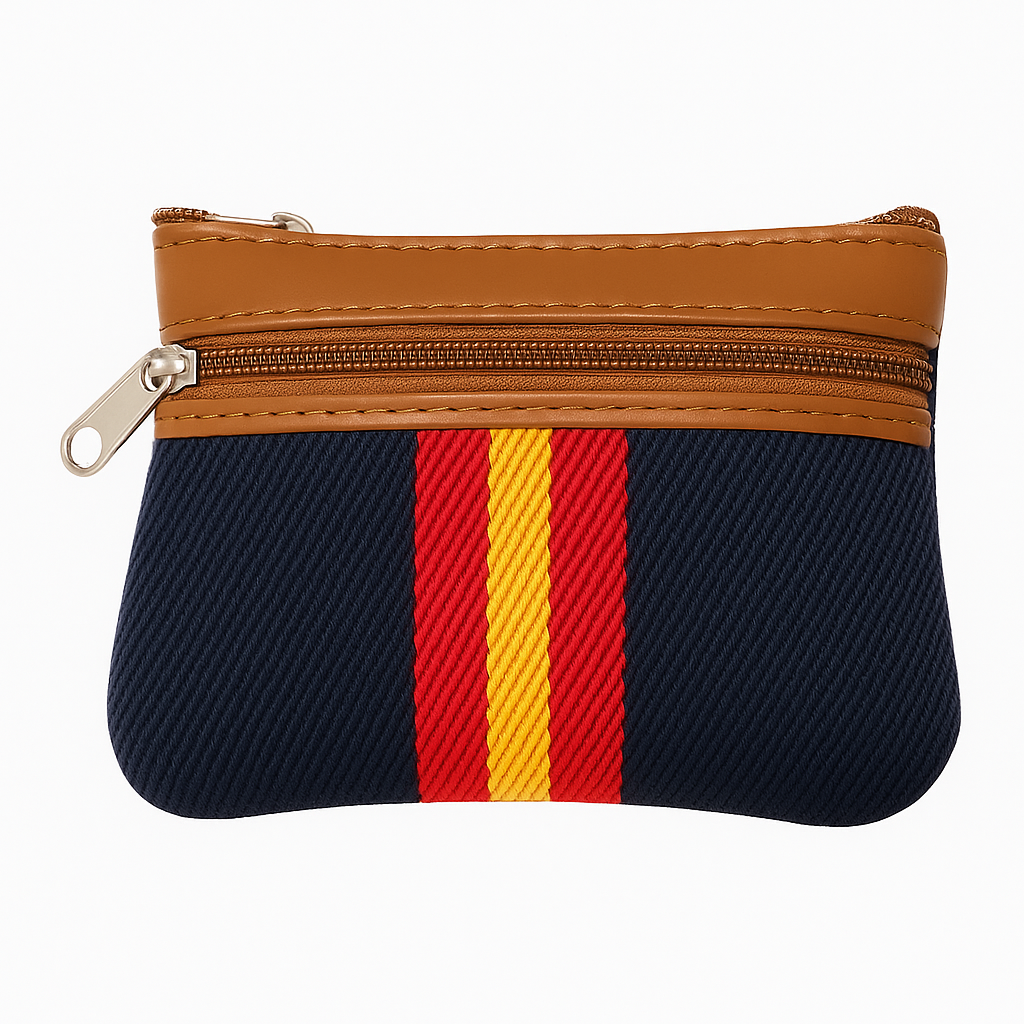 Este monedero azul marino con detalles en piel marrón y bandera de España combina elegancia y practicidad en su máxima expresión.