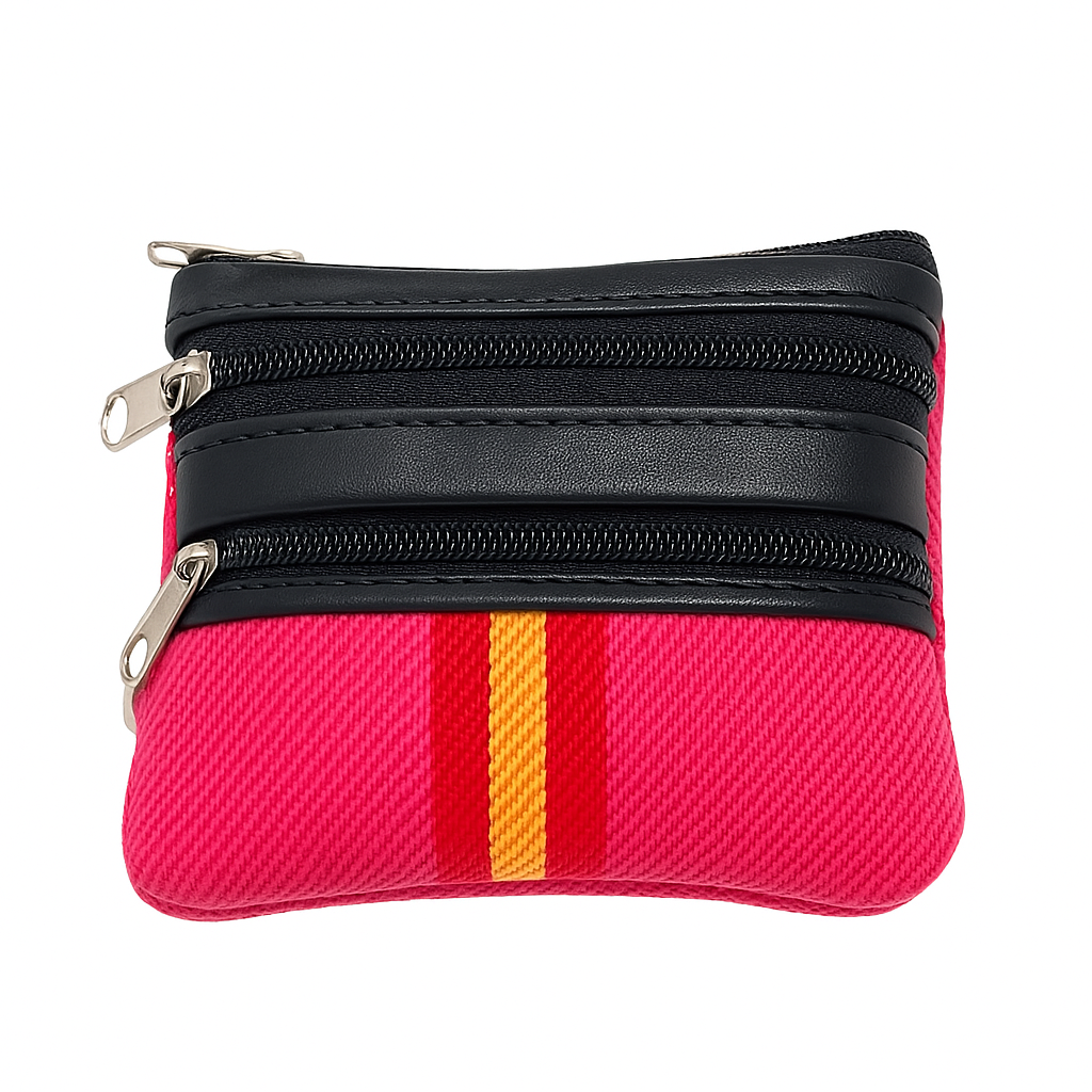 El monedero Cayetanos en color rosa fucsia combina tejido resistente con una banda en los colores de España y acabados en polipiel azul marino. Su diseño con doble cremallera metálica lo convierte en un complemento funcional y elegante para cualquier ocasión.