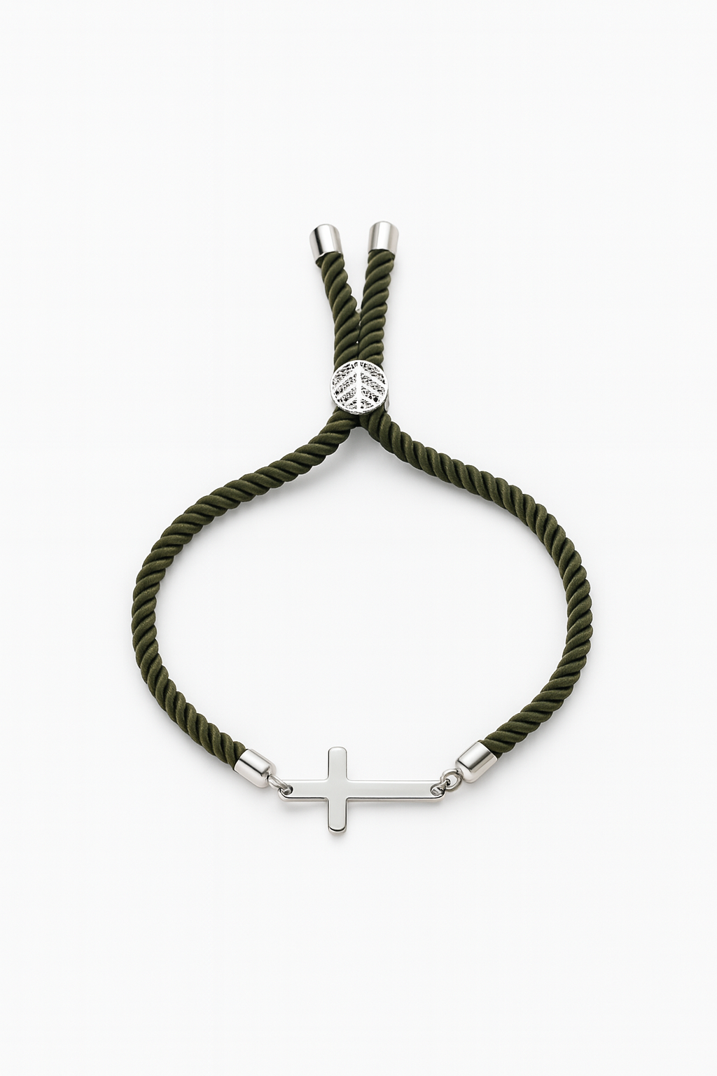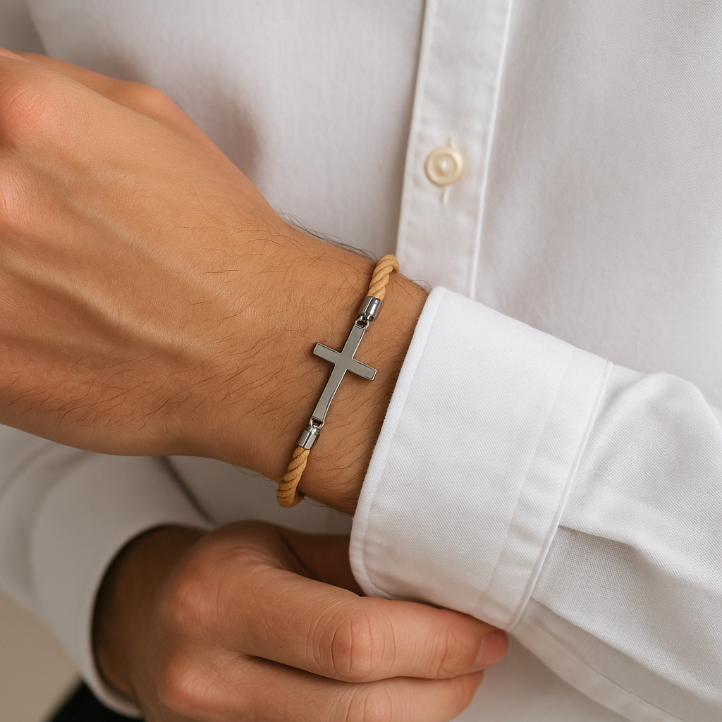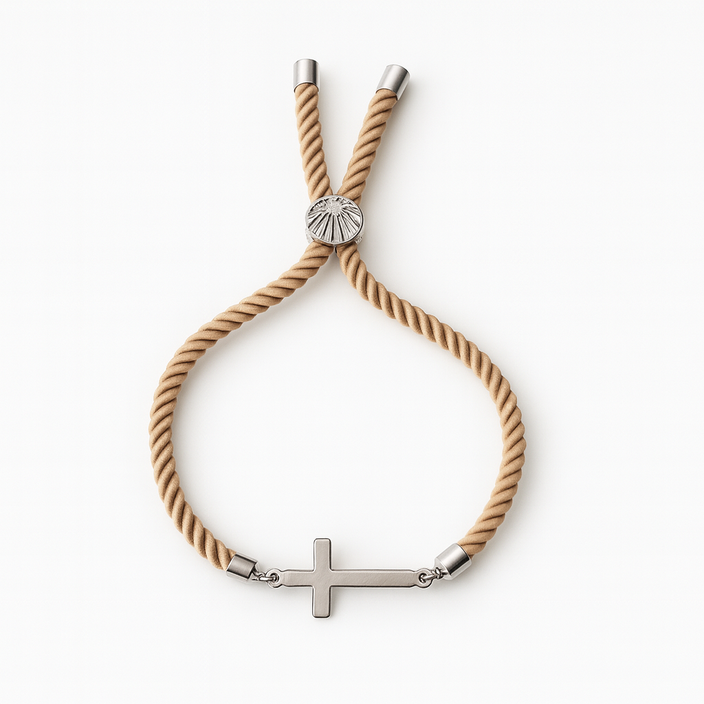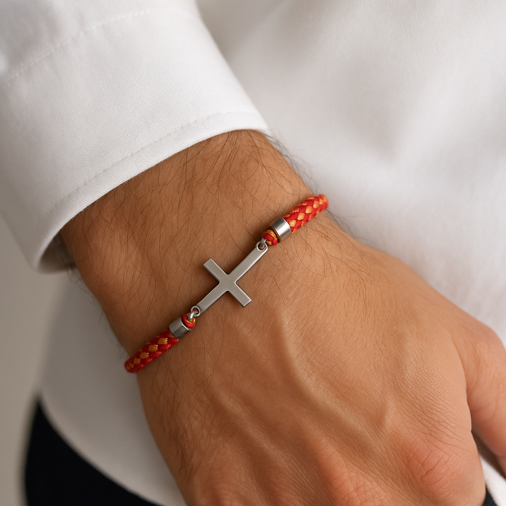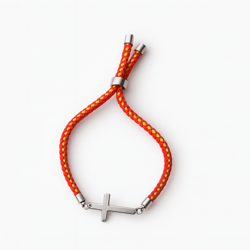 Pulsera ajustable con cruz de acero inoxidable y cordón trenzado de alta resistencia. Diseño limpio, cómodo y unisex para llevar a diario. Corredera metálica con detalle grabado y remates en acero.